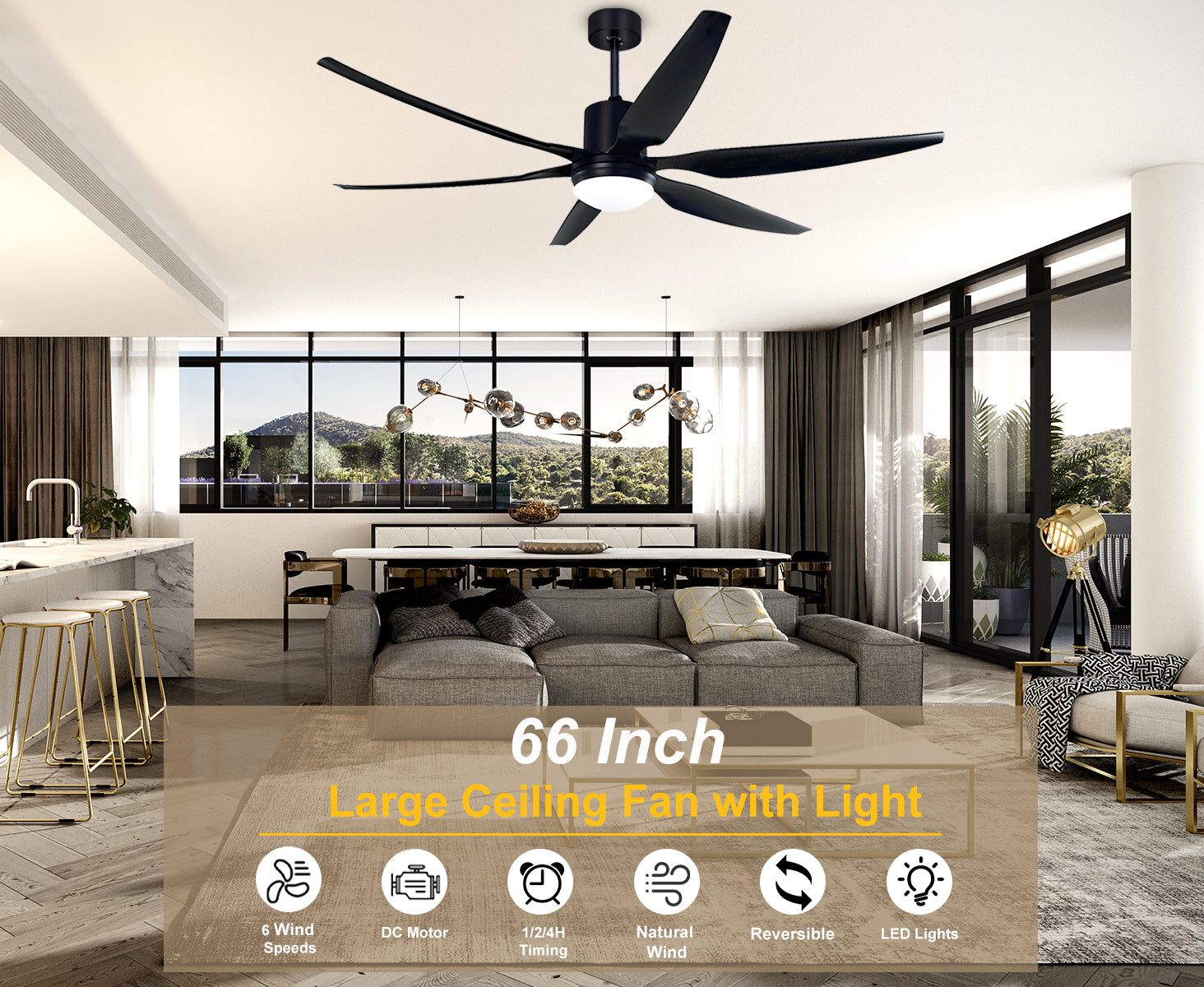 Large Ceiling Fan:With industry leading materials, this 66 inch ceiling fan will give your home the warm light and comfortable air movement. It produces up to 6758CFM to cover large spaces.