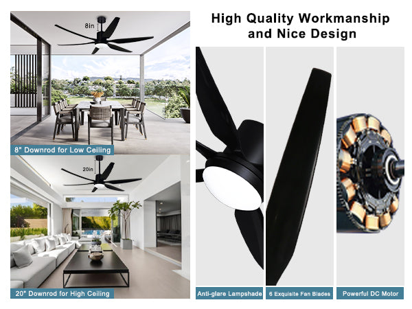 Easy to Install: Ohniyou ceiling fan with 2 down-rods: 8"/20", for low ceilings, high ceilings or slanted ceilings.