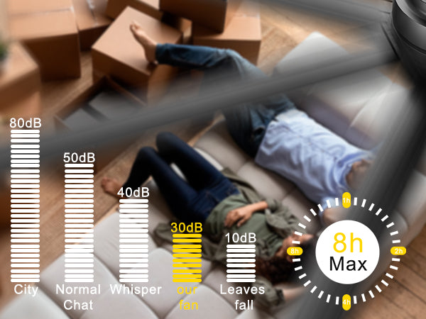 The sound level during work is 40dB at max wind speed and only 30dB at min.