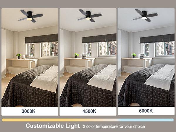 The small black ceiling fan with lights supports 3 colors (warm, cool, neutral), and brightness can be dimmed from 100% to 10% using the step-less dimming technology