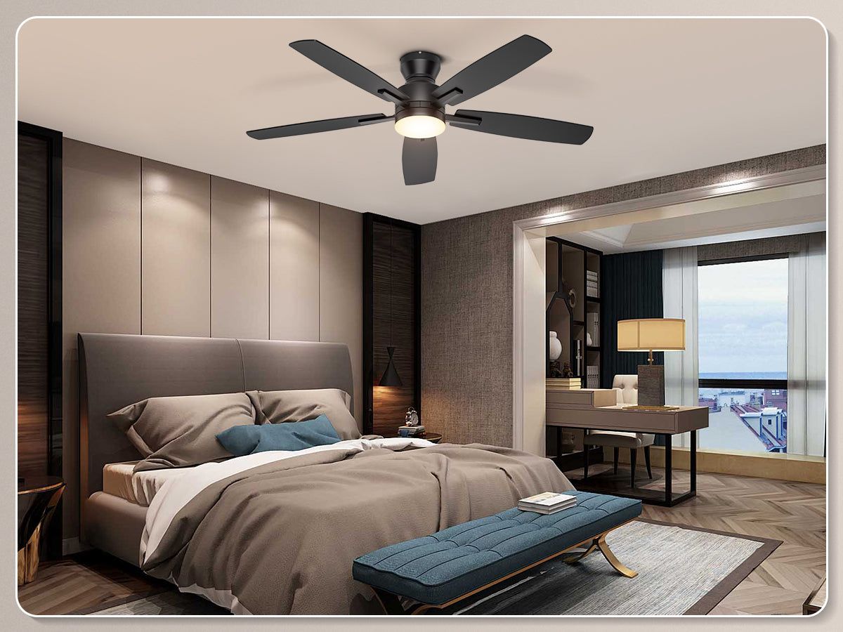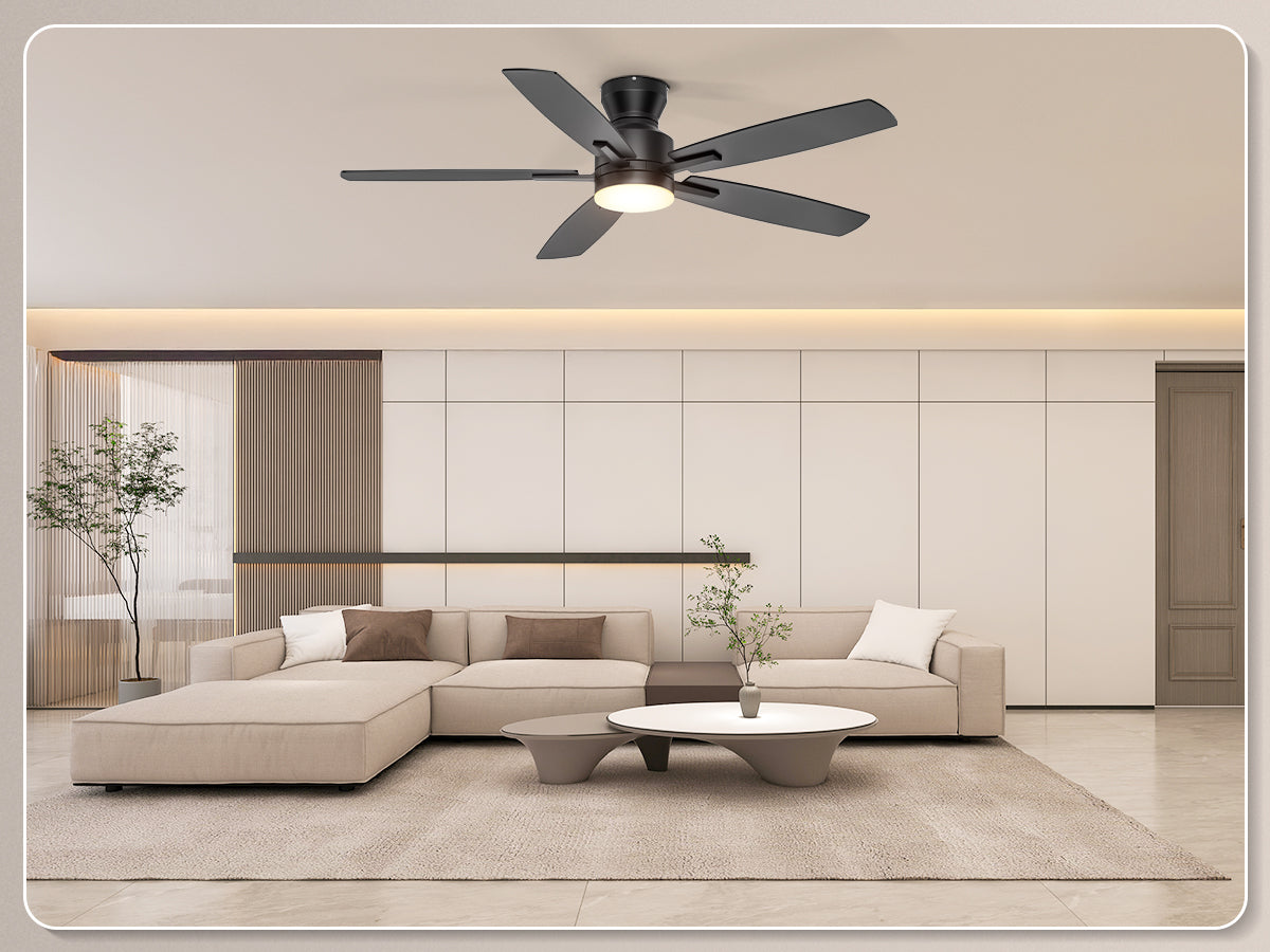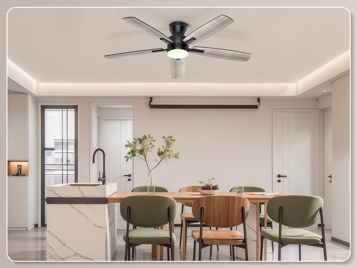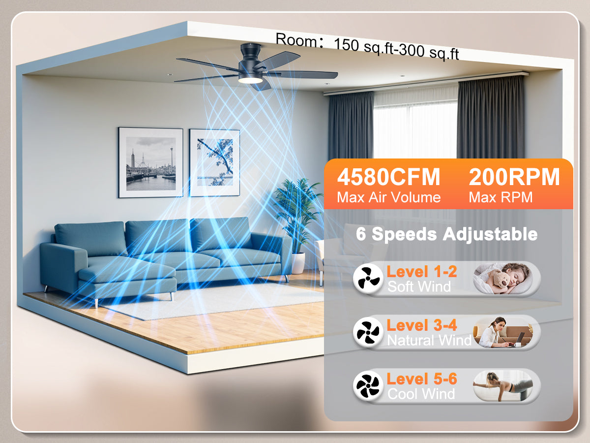 Our low profile ceiling fan with light features a ultra-quiet DC motor with noise levels as low as 20 dB. With 6-speed settings delivering 4,580 CFM airflow, the reversible motor provides summer cooling breezes or winter warm air circulation – ideal for year-round climate control