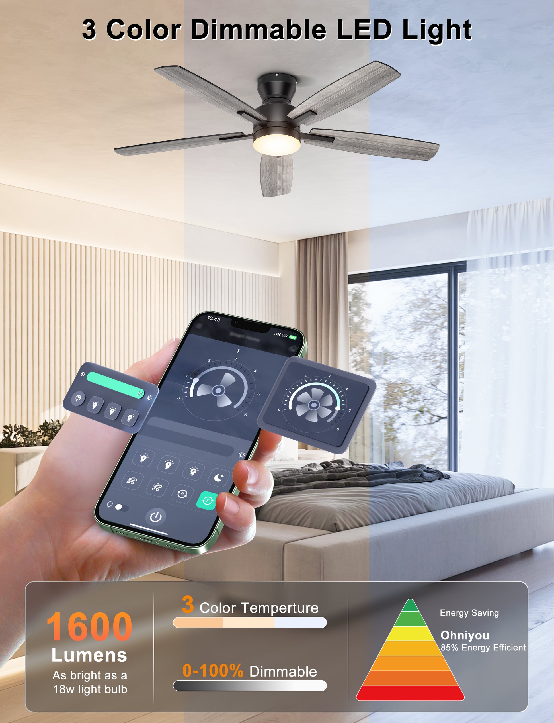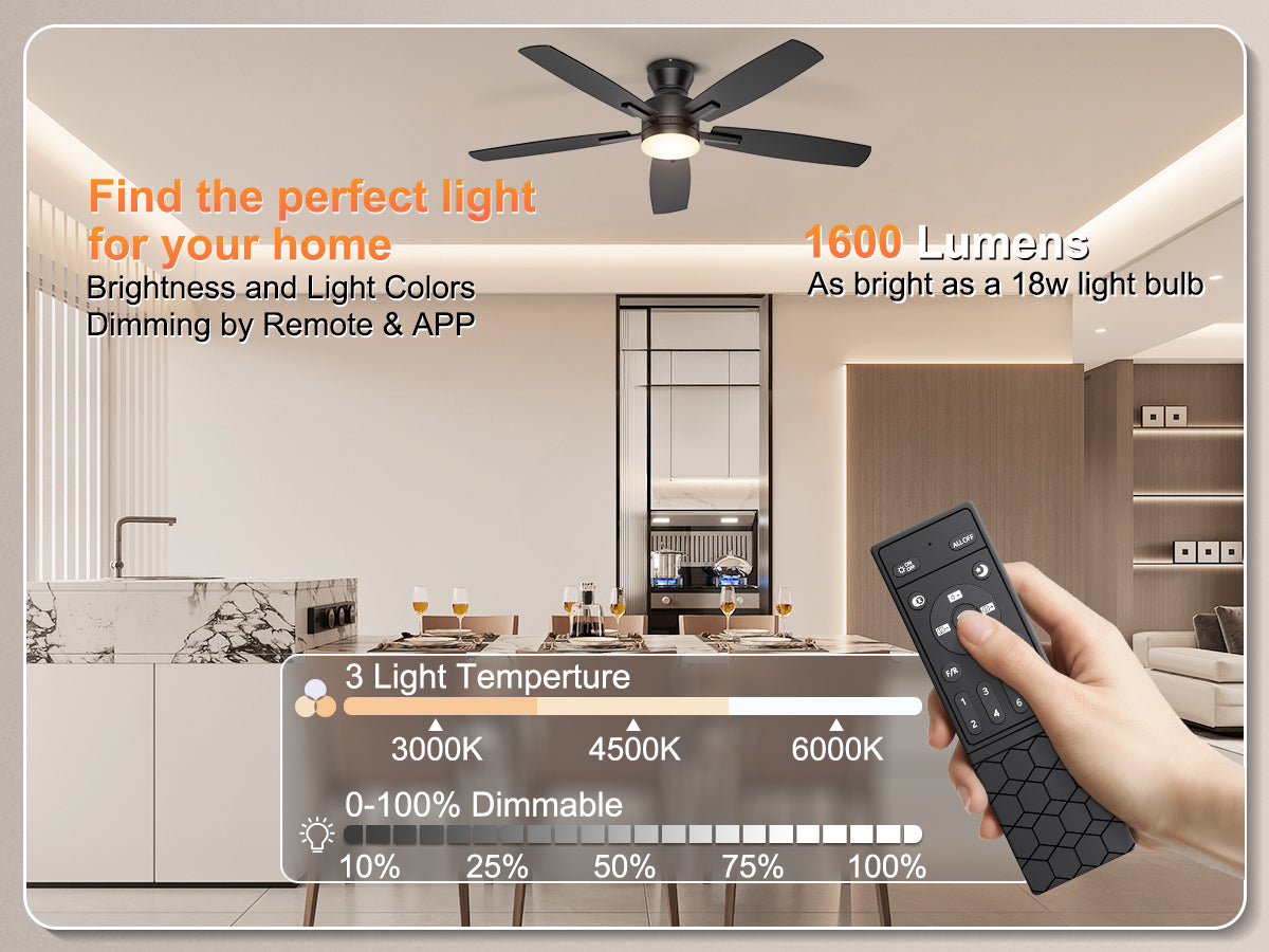 Equipped with an 18W LED light source (3000K warm/4500K natural/6000K cool white), this flush mount ceiling fan offers eye-friendly, flicker-free illumination and 5%-100% dimmability