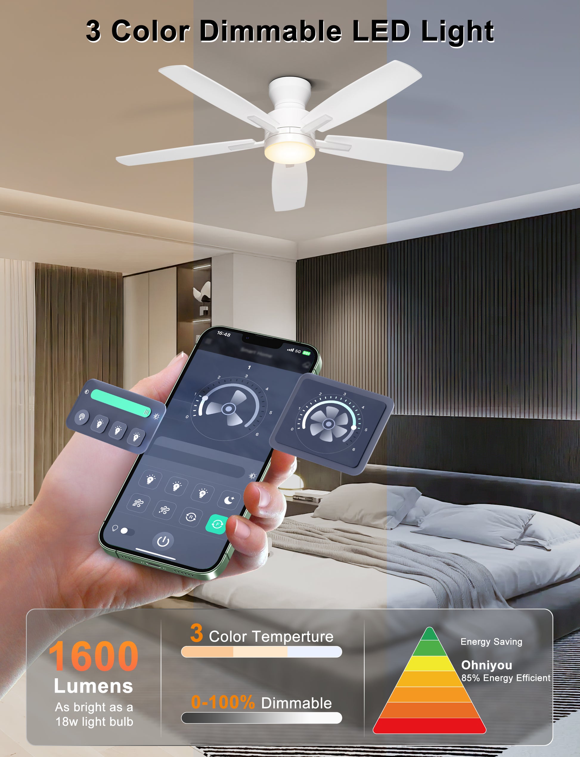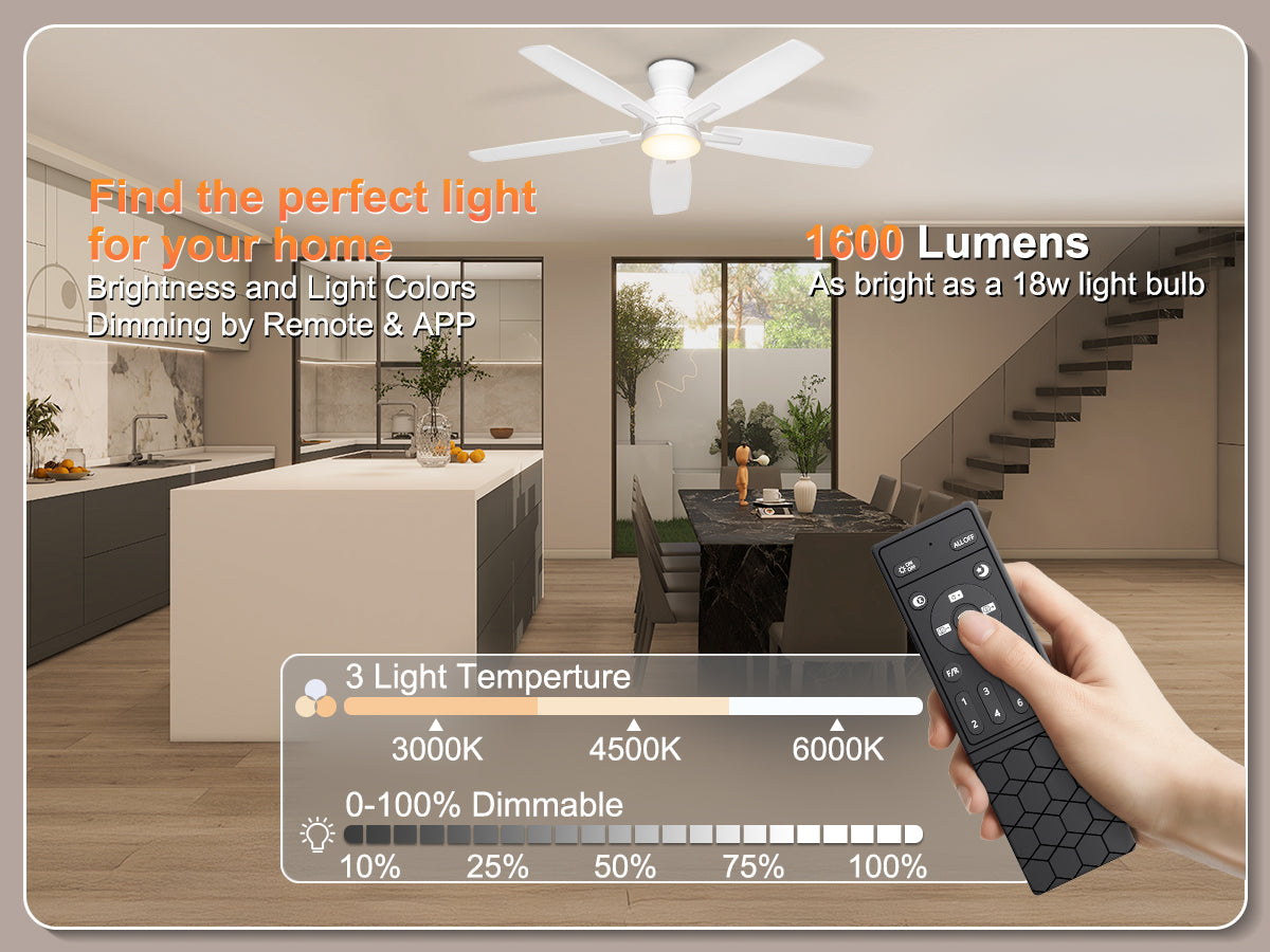 Equipped with an 18W LED light source (3000K warm/4500K natural/6000K cool white), this flush mount ceiling fan offers eye-friendly, flicker-free illumination and 5%-100% dimmability