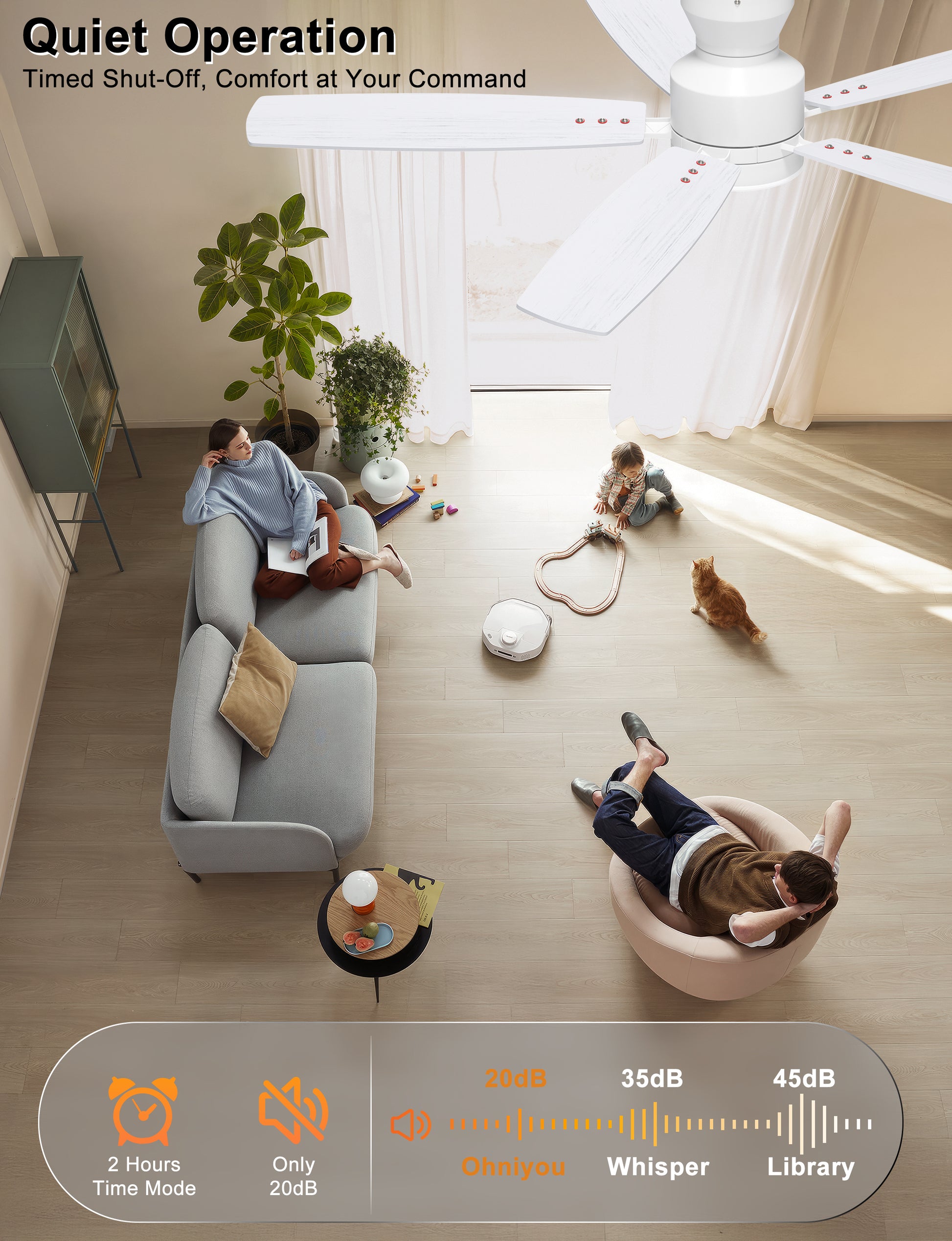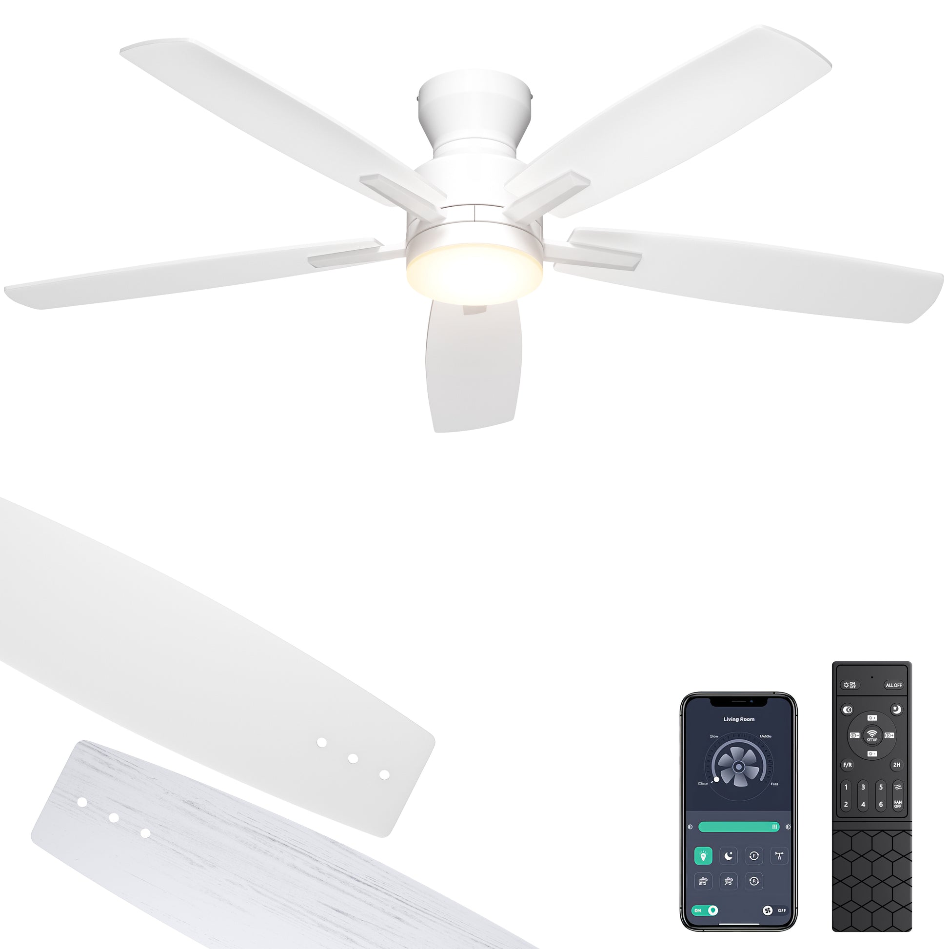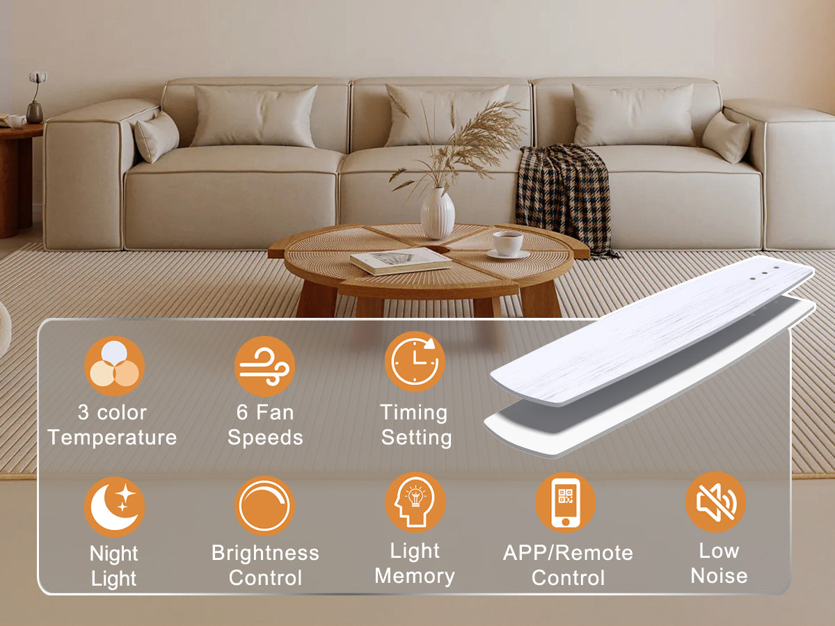 This modern ceiling fan with lights has all functions controllable via both the included remote and smartphone app. Adjust fan speed, light brightness/color, and set timers hands-free