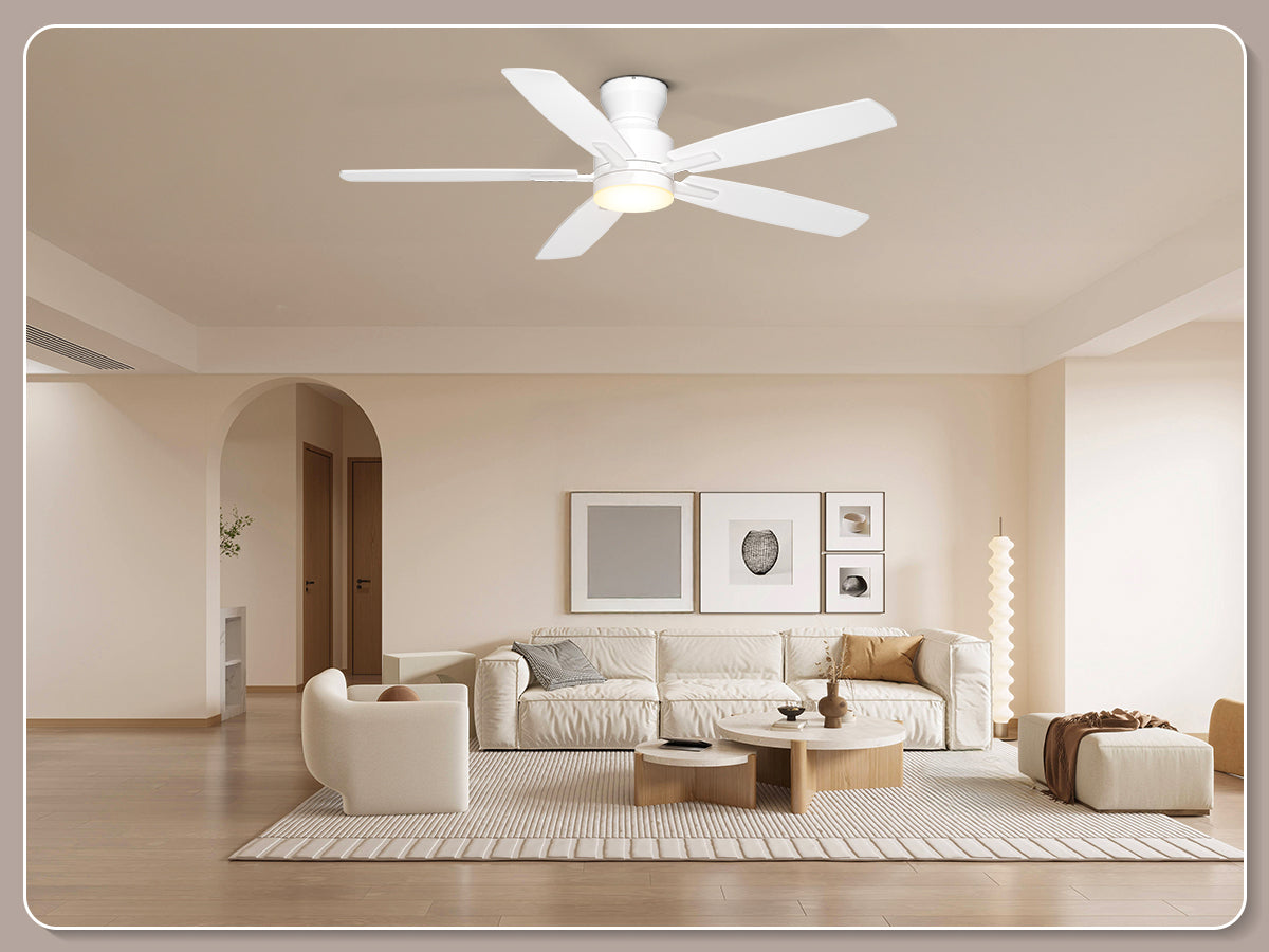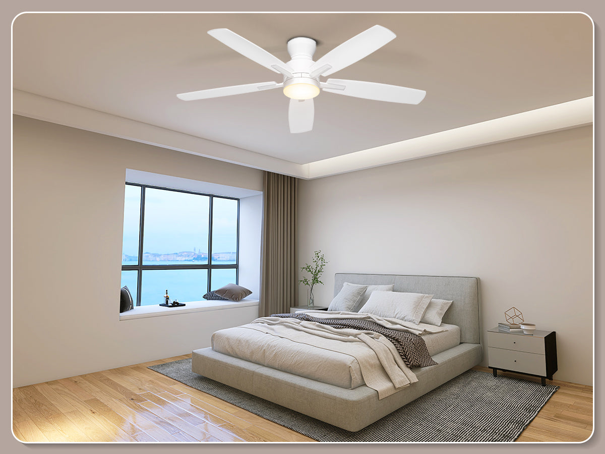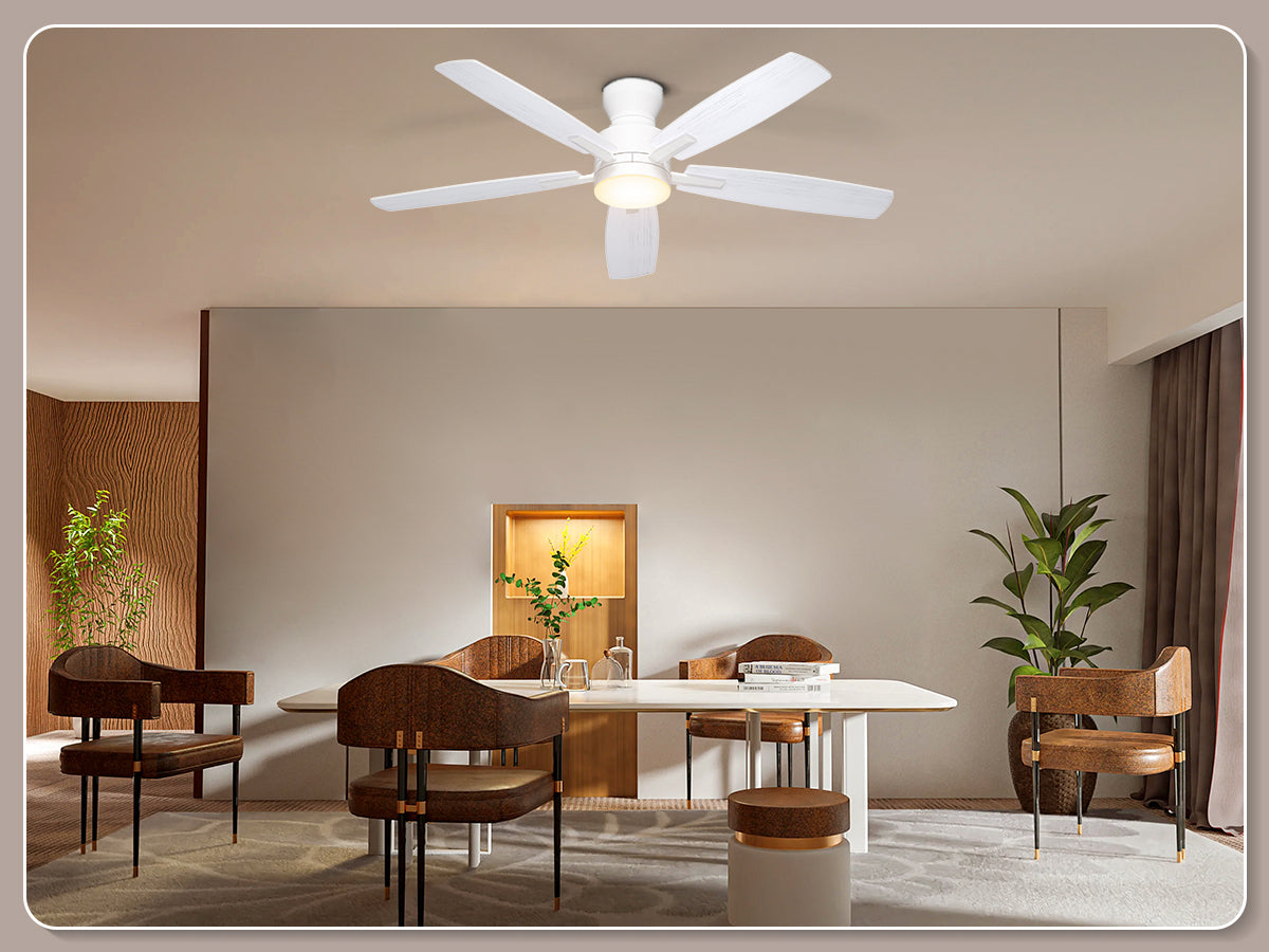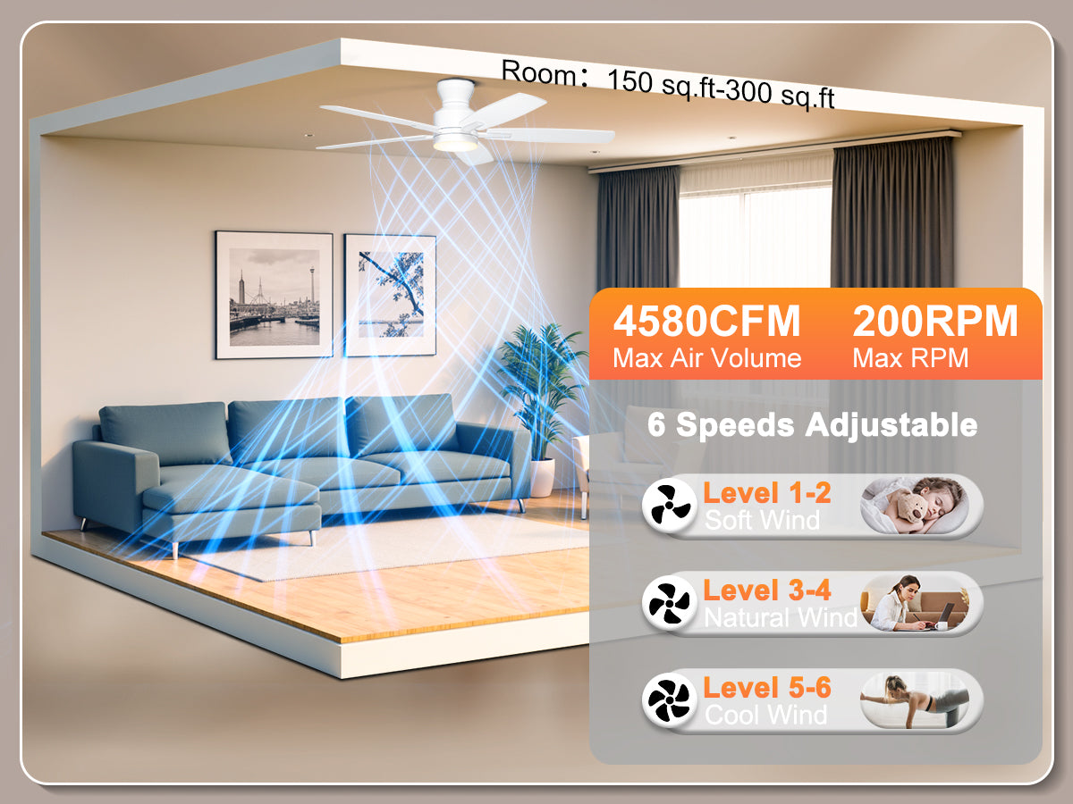Our low profile ceiling fan with light features a ultra-quiet DC motor with noise levels as low as 20 dB. With 6-speed settings delivering 4,580 CFM airflow, the reversible motor provides summer cooling breezes or winter warm air circulation – ideal for year-round climate control